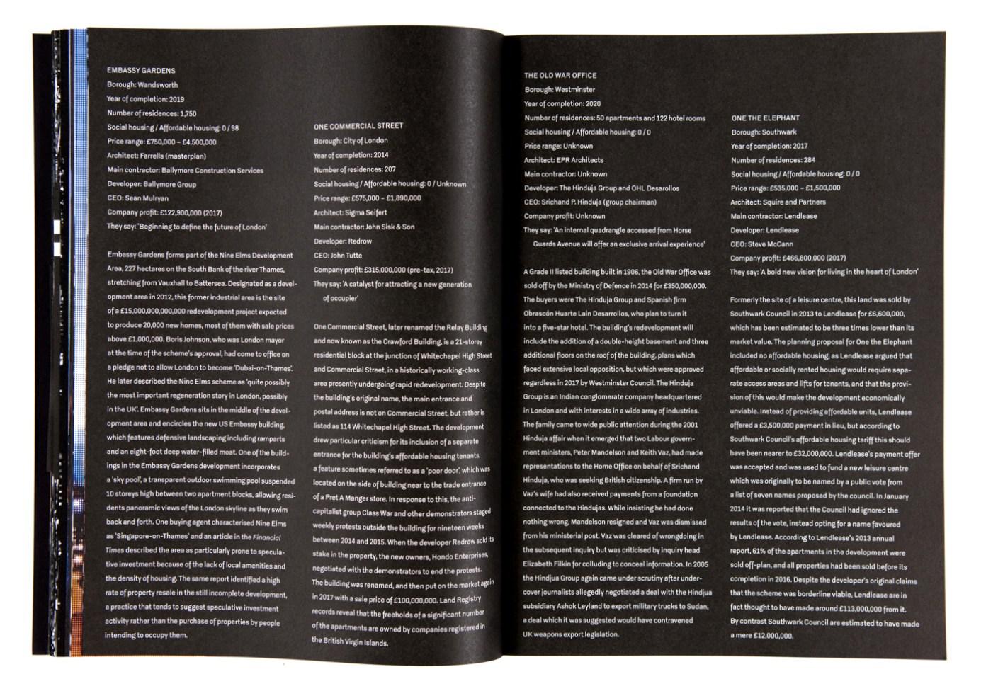 The second part of the book is a selection of images taken from publicity billboards advertising the projects and the good life in them. Accompanied by information on the building itself, year of construction, housing possibilities, architects, developing companies, profits; the hard truth is revealed. Part of the city’s history is destroyed on an altar of development and London is losing significant parts of its architectural past. All these references bring to mind Guy Debord’s and his essay ‘Introduction à une critique de la géographie urbaine’, published in Les lèvres nues no6, Brussels, 1955 : «La psychogéographie se proposerait l’étude des lois exactes, et des effets précis du milieu géographique, consciemment aménagé ou non, agissant directement sur le comportement affectif des individus. L’adjectif psychogéographique, conservant un assez plaisant vague, peut donc s’appliquer aux données établies par ce genre d’investigation, aux résultats de leur influence sur les sentiments humains, et même plus généralement à toute situation ou toute conduite qui paraissent relever du même esprit de découverte. » Exactly the reflection on the relationship of the individual with the cityscape, which Bush so eloquently evokes in the introduction of the book. Questions on the preservation of architectural heritage are raised, along with questions on political choices. Construction provides a false sentiment of development, shows the economy is thriving and attracts potential investors. I guess London is looking for a new identity far from its imperialistic past and well into a new capitalistic globalised world.