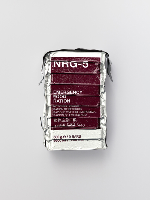 © Lise Straatsma from the series 'The Alpha Strategy'. NRG-5 Emergency Food Ration. NRG-5 contains 2300 kcal/9600 kJ per packet of 500 grams. It has an expiration date over ten years in the future. The VN and the Red Cross are know to use NRG-5, with one packet feeding a grown person up to two days.