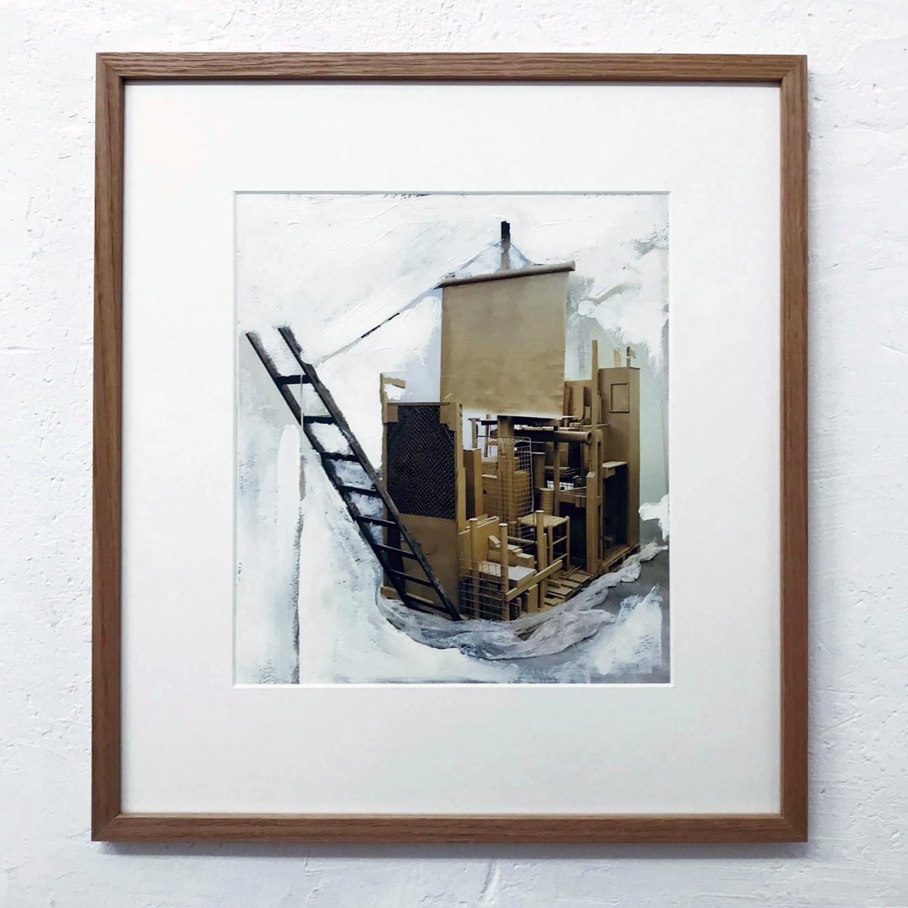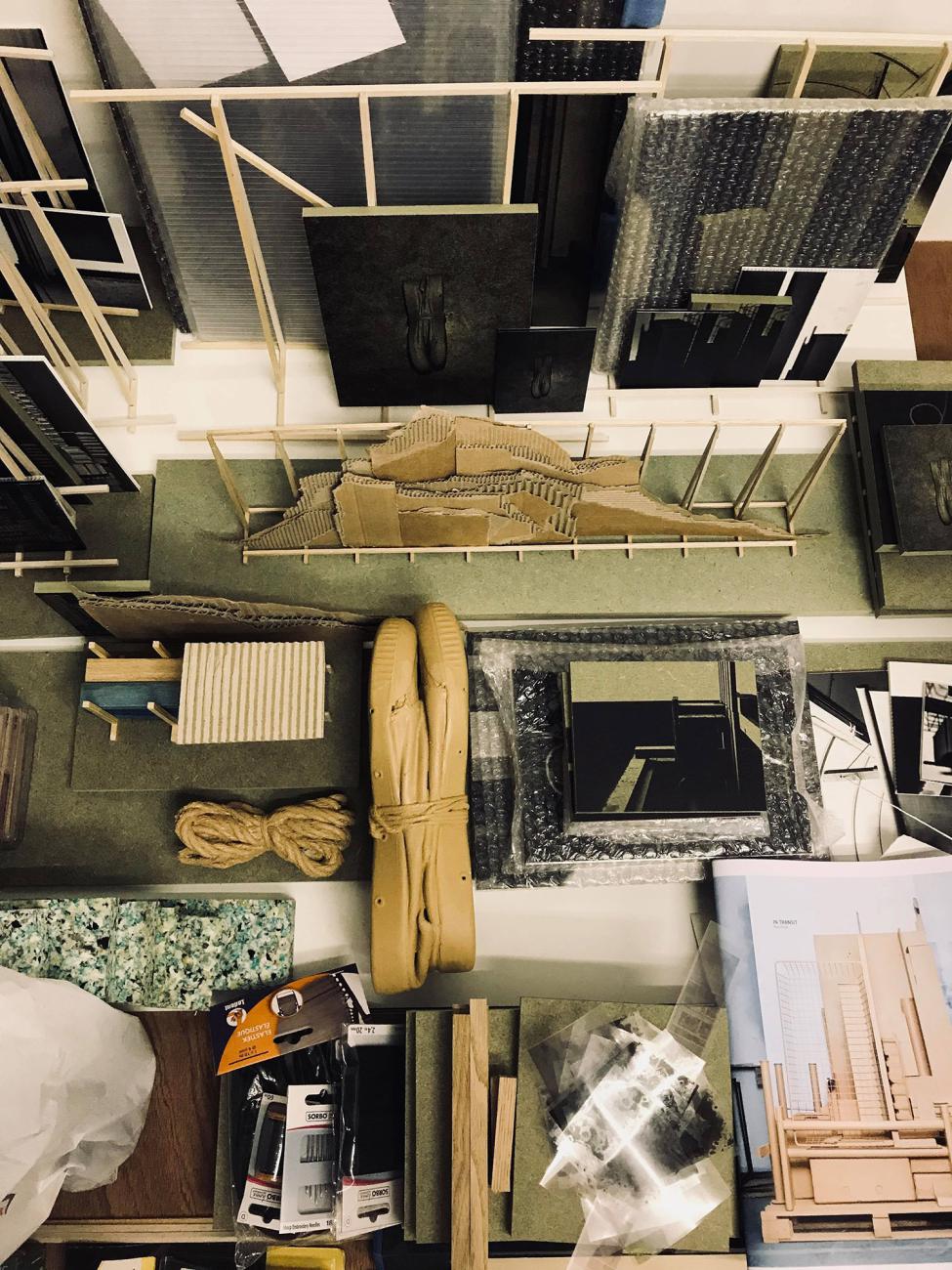 The somewhat monotonous, loamy construction that is assembled with recycled materials was born in a rather naive way during the move of his studio. In addition to the boxes and other packaging materials his previous work You are no t here is partially reused in this urban landscape. Proot has the uncontrollable urge to create things that are not tangible: surroundings where he can wander around, let his mind flow and sparkle for a moment. The modular installation consisting of paper, cardboard, plaster, wood and the binder; glue, screws, plastic, nails and thumbtacks make it possible to work very impulsively and quickly. The process of this creation is just as important and perhaps more important than the goal, it reflects life, impulsive action.