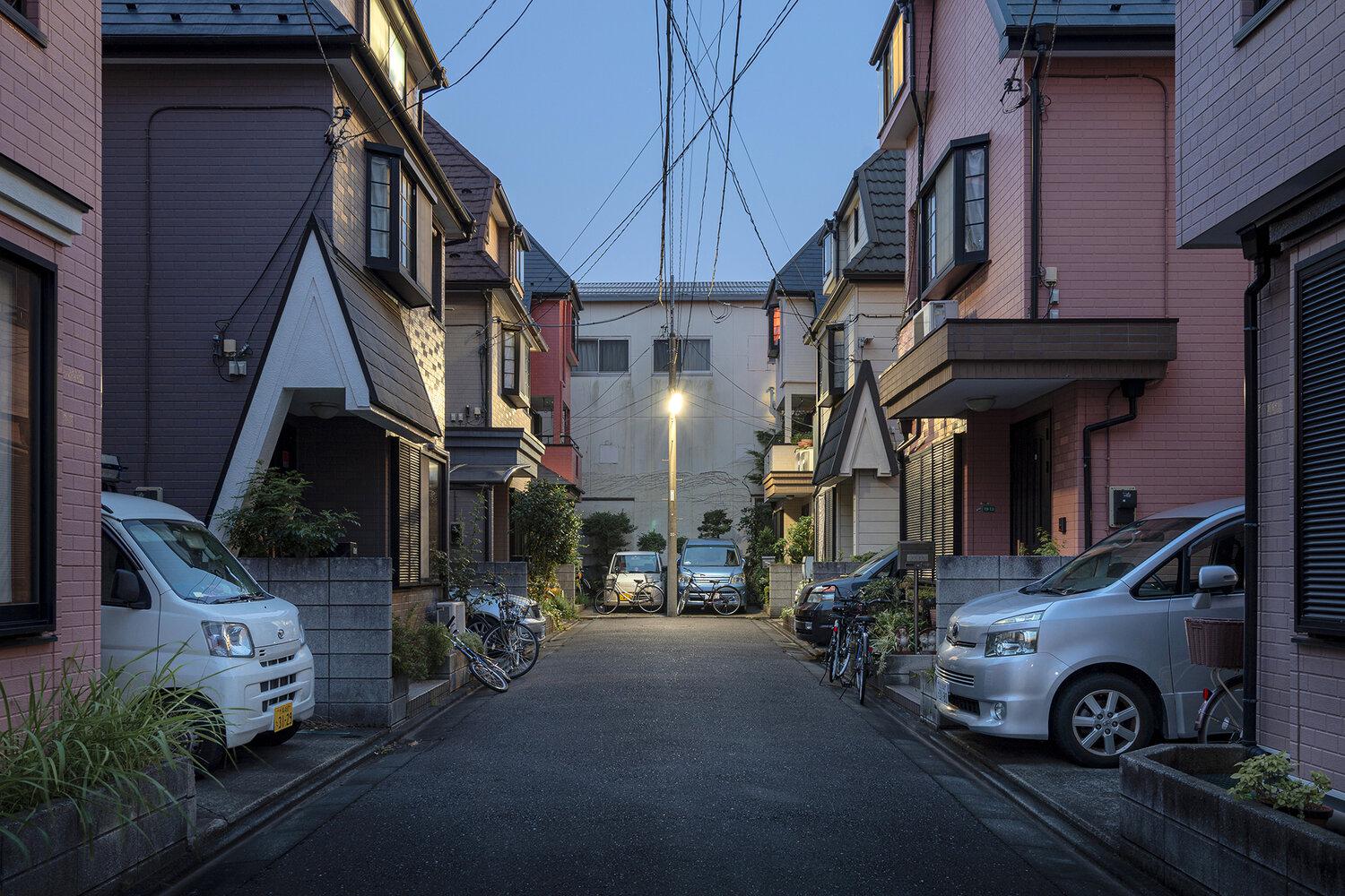 © Alessandro Zanoni from the series "Kuruma". Ichikawa, Chiba prefecture, the first light of dawn. Houses with parking spaces for cars and bicycles.