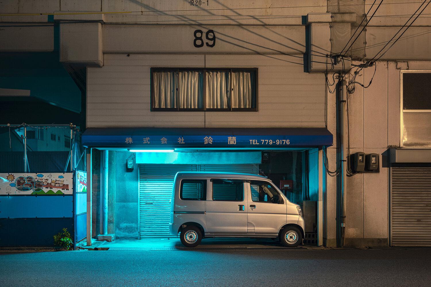 © Alessandro Zanoni from the series "Kuruma". Osaka, Tennoji ward: a kei car parked in front of a small, shuttered shop