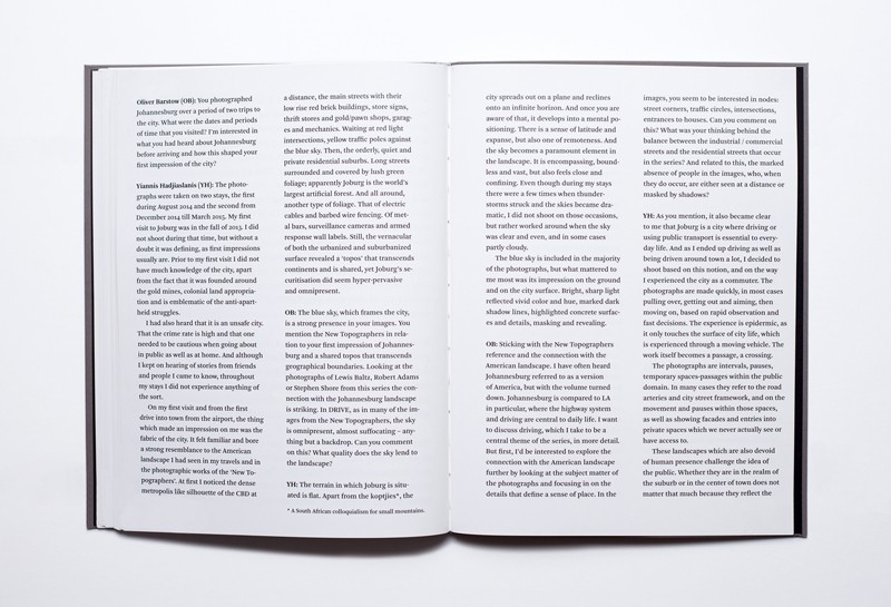 Hadjiaslanis visited the city and decided to photograph it. Highly inspired by the New Topographic Movement he found familiarities in the South African landscape with the American landscape and somehow the field did not feel so off, so strange, so new. Johannesburg is considered an unsafe city and this feeling of fear is quite obvious in the images. Cameras, fences, bars seem to provide some kind of protection to civilians from evil subjects. Where is the violence coming from and to whom is it addressed is a question that comes to mind, and the images in the book evoke that question quite eloquently, pushing the reader to some personal research concerning the South African city. In some of the images, vegetation has taken over abandoned buildings, creating a feeling of desertion and abandonment; resulting in a demonstration about the power of nature over human activity. Hadjiaslanis explains that even though he was warned by friends and heard a number of personal stories of random violence himself, he never encountered danger in his journey around the city. But then again…he was driven around the city or drove himself, chose the spots, took the pictures, moved on. So he named the book Drive and that is an honest title explaining his point of view. The images concentrate on commercial roads, intersections, nodes and residential areas around the city. His concept focuses on the idea of the visitor experiencing a slight glimpse of the whole and just scratching the surface of the structure on this place on earth.